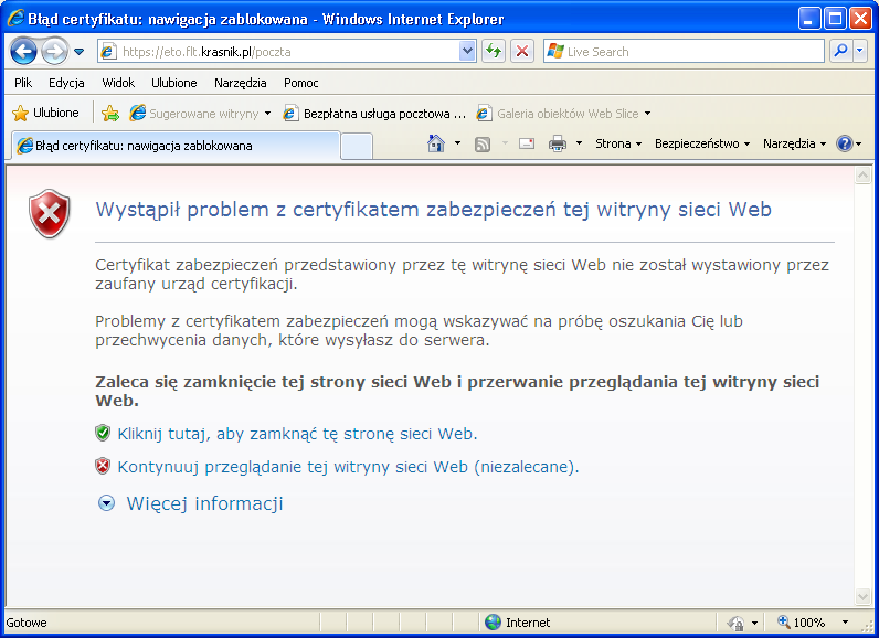 zobacz przykład]. Można wybrać opcję "Kontynuuj przeglądanie tej witryny sieci WEB (niezalecane)", lub zainstalować certyfikat SSL w systemie.